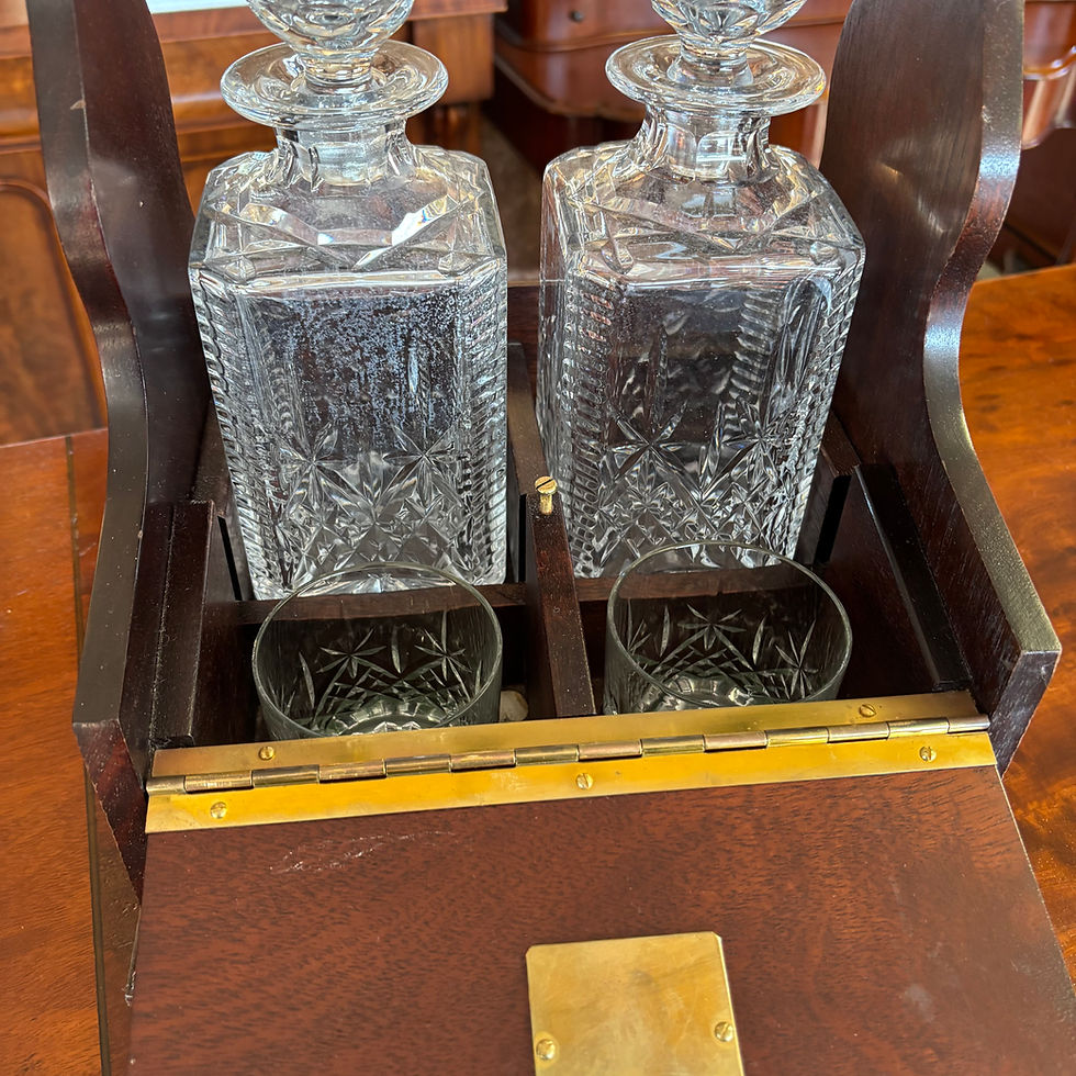 Vintage mahogany tantalus set, includes two crystal decanters & two glasses